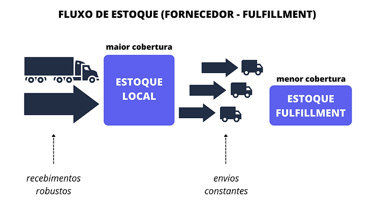 Como é necessário um giro grande dentro do estoque do Fulfillment, o vendedor não pode deixar que o tempo alto de reposição de seu fornecedor comprometa o seu reabastecimento de estoque por lá. Dessa forma, o vendedor acaba reposições mais volumosas em seu estoque local, usando-o como um estoque regulador, mantendo-o com uma cobertura maior e, através de reposições menores e contínuas, o estoque do Fulfillment é mantido bem abastecido.